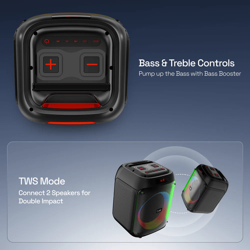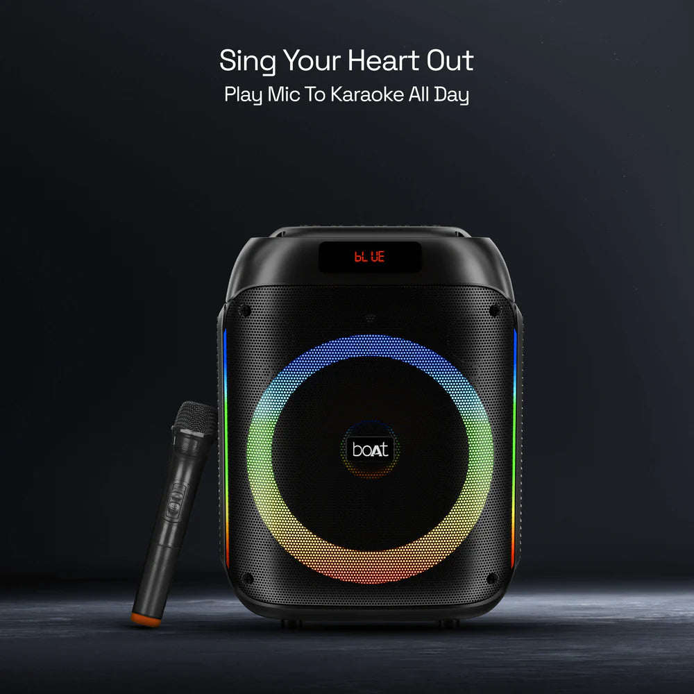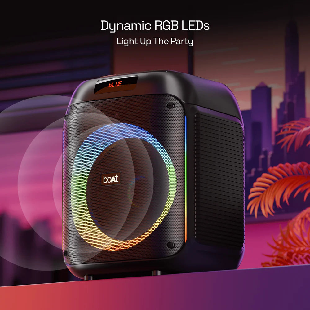 Your search for the perfect party speaker ends here. The boAt Party Pal 220 isn't just a speaker; it's the life of the party. Engineered to deliver an electrifying 120W RMS of pure, powerful sound, it ensures your music isn't just heard—it's felt. From the deep, punchy bass that gets everyone on the dance floor to the dynamic RGB light show that syncs with the beat, every gathering becomes an unforgettable event.
